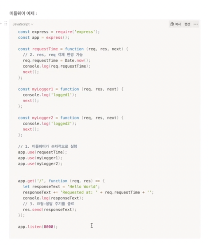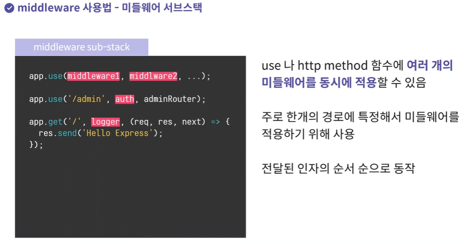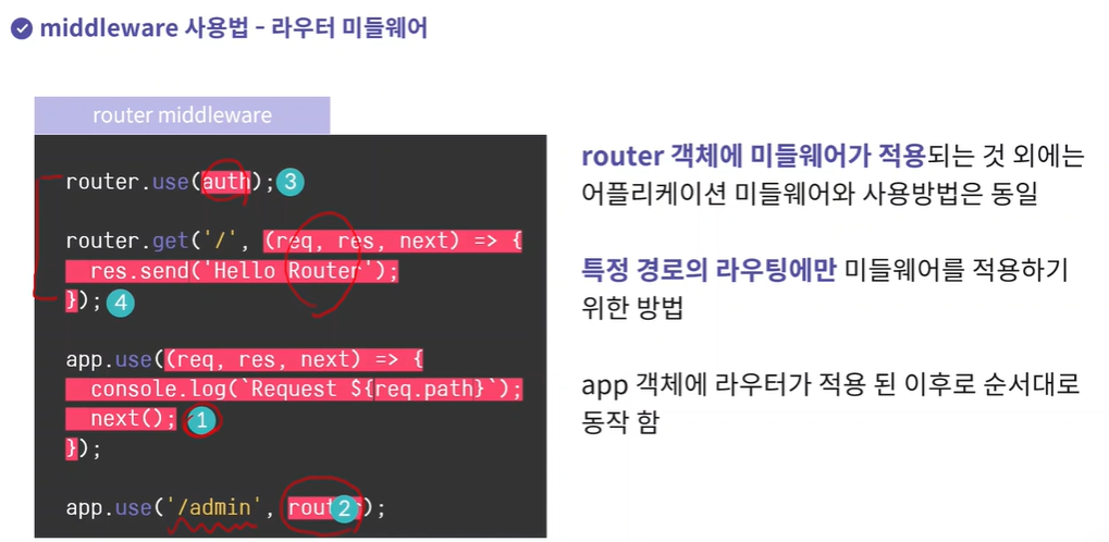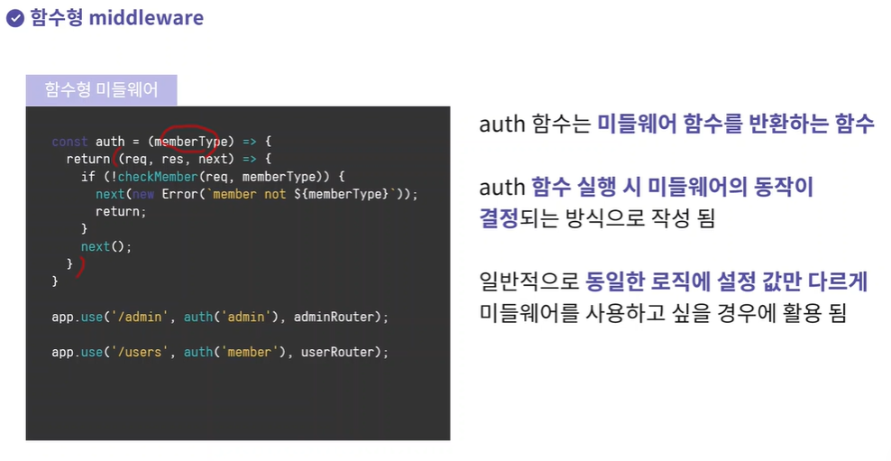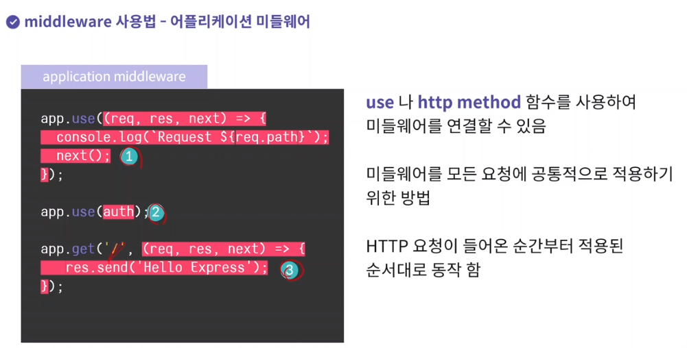 이렇게 등록할 수도 있고 get이나 post요청 중간에 함수를 넣어서 미들웨어를 추가해줄수도 있다.
