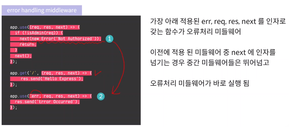 일반적으로 가장 마지막에 위치하는 미들웨어. err, req, res, next네가지 인자를 가진다. 앞선 미들웨어에서 next함수에 인자가 전달되면 실행된다. next함수에 인자를 전달하면 오류처리 미들웨어가 실행된다.
