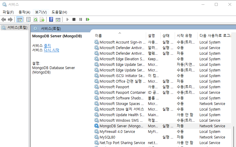 서비스 -> MongoDB 찾고 -> 오른쪽버튼 클릭 -> 시작
