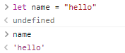 name이라는 변수를 선언했다. name을 쳤더니 그냥 'hello'만 나온다.