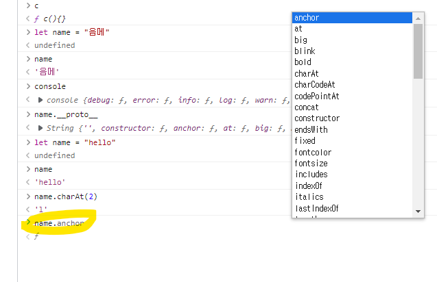 String이라고하는 생성자함수를 name이 상속받고있다. 그렇기때문에 charAt같은 내부연산자를 쓸 수 있는 것이다.