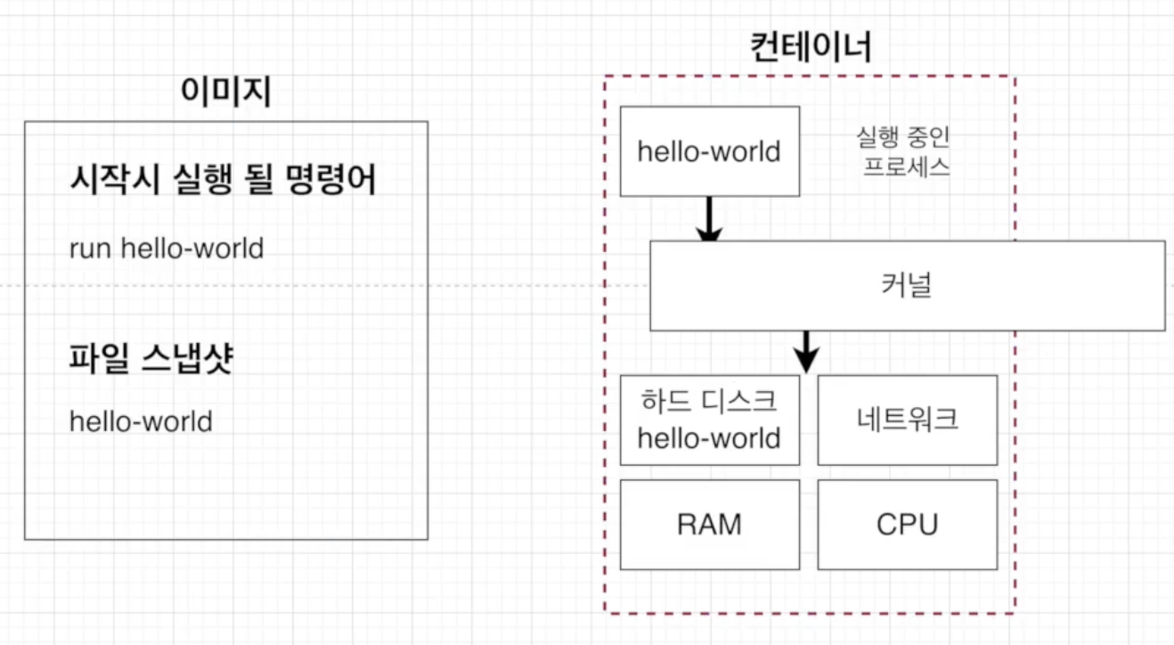 파일 스냅샷을 컨테이너의 하드디스크에 넣어주고 명령어도 넣어준다.