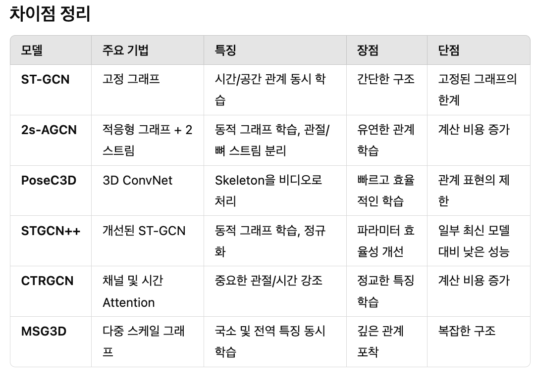 이 모델들은 모두 Skeleton-based Action Recognition에 사용되는 방법으로, 인간의 동작을 골격 데이터를 기반으로 분석하고 분류하는 데 초점을 맞추고 있습니다. 각 모델은 구조와 처리 방식에서 서로 다른 특징을 가지고 있으며, 발전된 성능과 효율성을 제공한다.