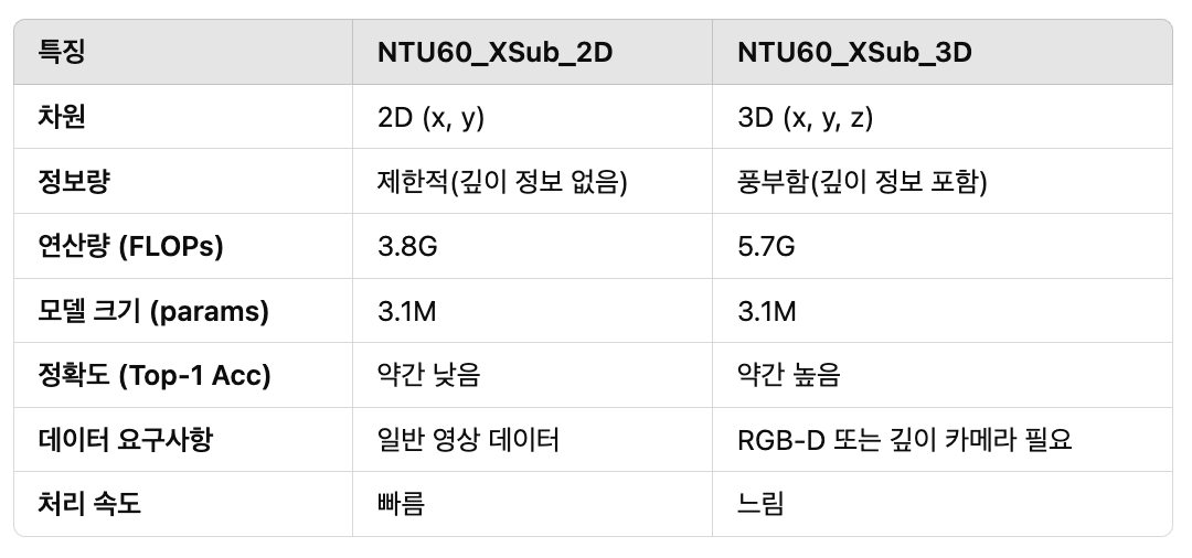 NTU60_XSub_2D와 NTU60_XSub_3D는 스켈레톤 데이터의 차원에 따라 구분됌.
