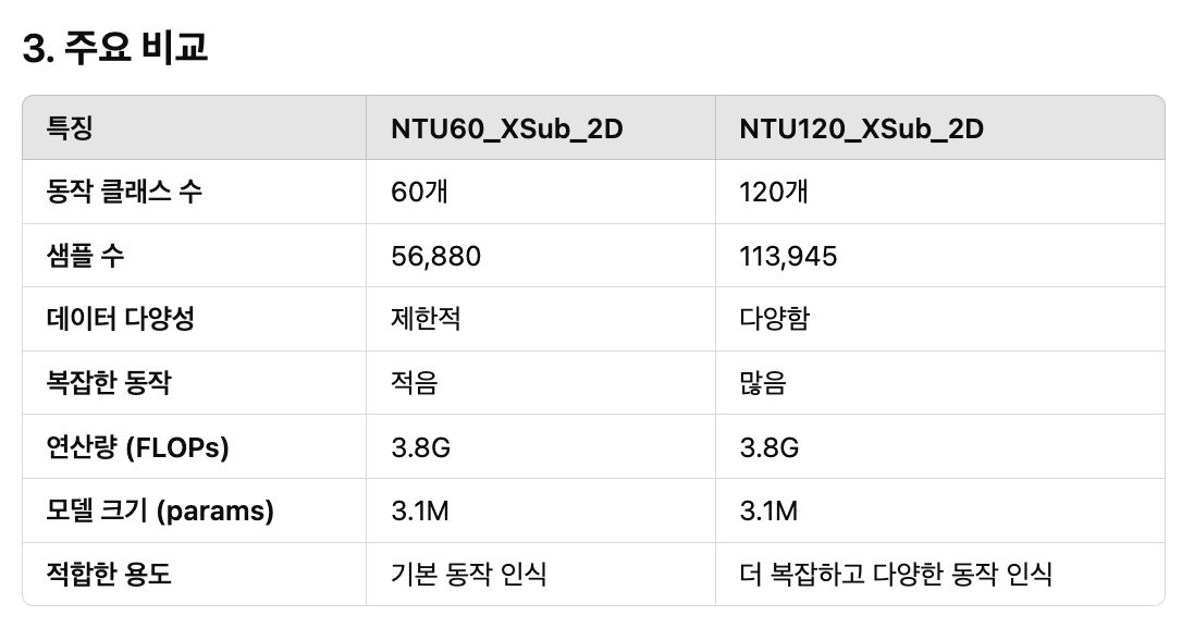 NTU60_XSub_2D와 NTU120_XSub_2D의 차이는 데이터셋 크기와 동작 클래스 수에서 비롯됩니다